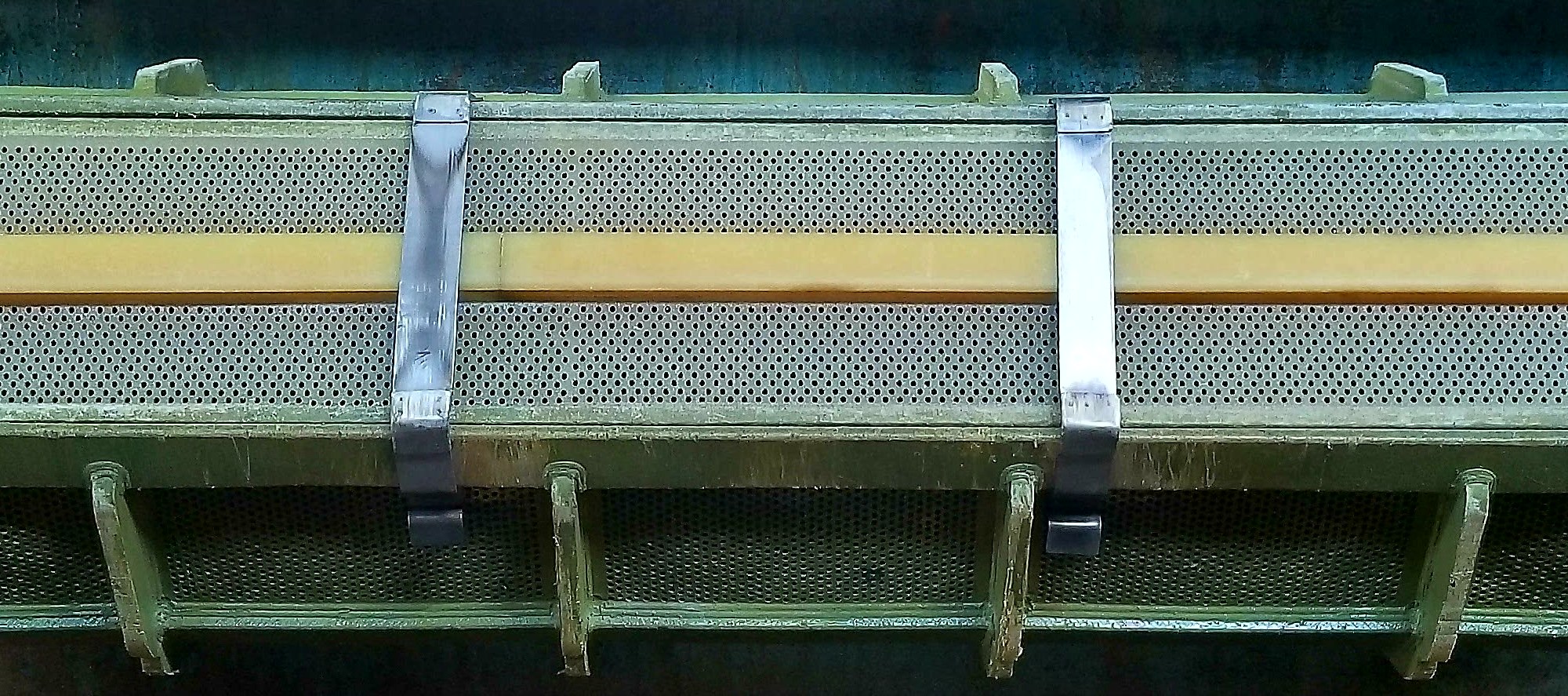 The barrel in this image has been loaded with 200lbs of copper electrical components for tin plating. The parts spread from one end of the barrel to the other and complete the electrical circuit between the 2 danglers. This is the optimal barrel load for these specific items. It is important to remember that not all materials are created equally. An optimal load in a 7 foot barrel can range from 50lbs to 350lbs depending on the metals, dimensions and dynamics that occur during the tumbling process.